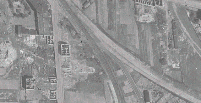 To jeszcze, dla porównania, wstawię zdjęcie dokładnie tego samego fragmentu miasta jak powyżej zrobione w roku 1945. Widać na nim zniszczenia wojenne.